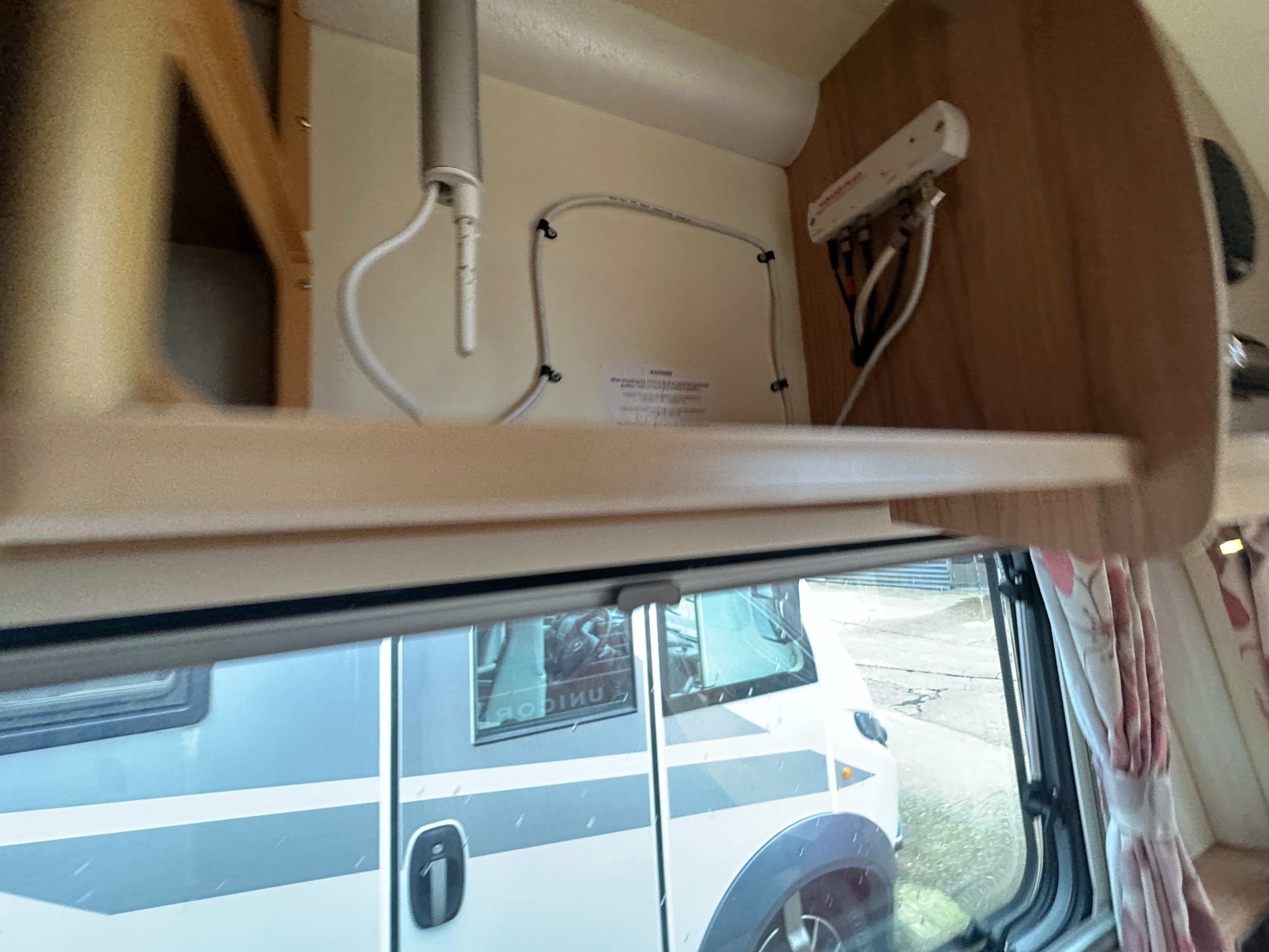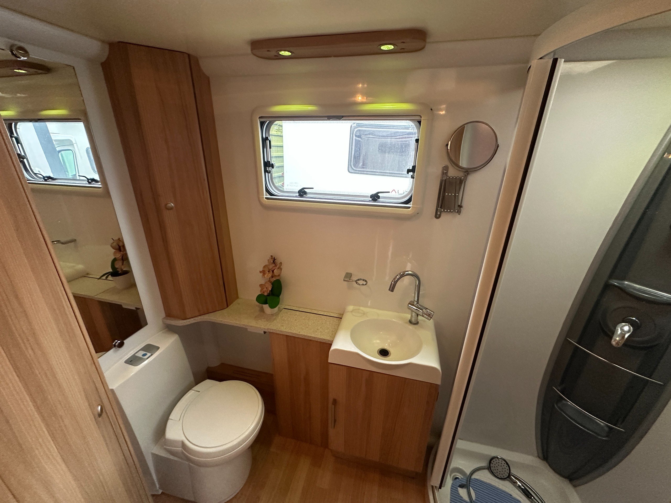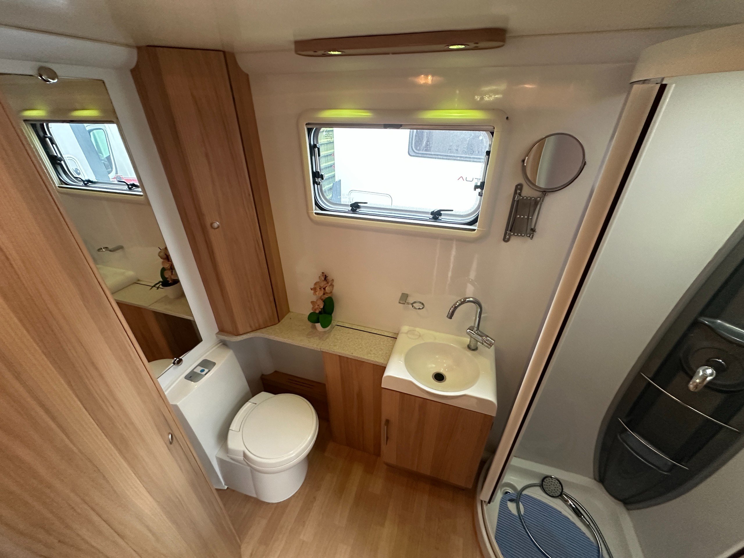 The full-width rear shower room contains a large wardrobe and cupboards. There is also a sink, mirror, Thetford cassette toilet and a seperate shower cubicle