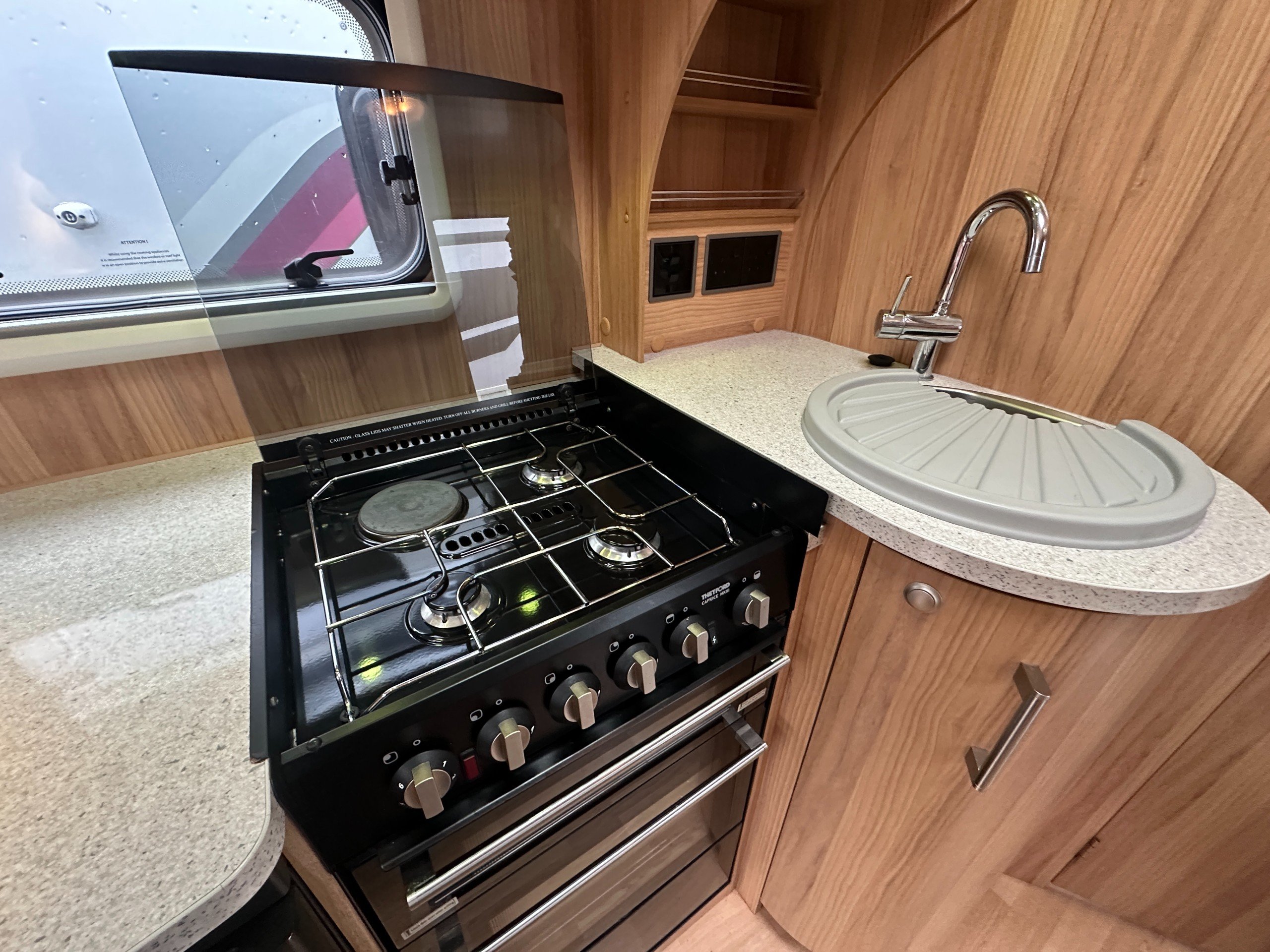 To the rear of the hob, oven and grill is the sink, set into plenty of work surface, with a wide cabinet beneath. Kitchen storage space is more than sufficient. Thers is also a 3 way fridge.